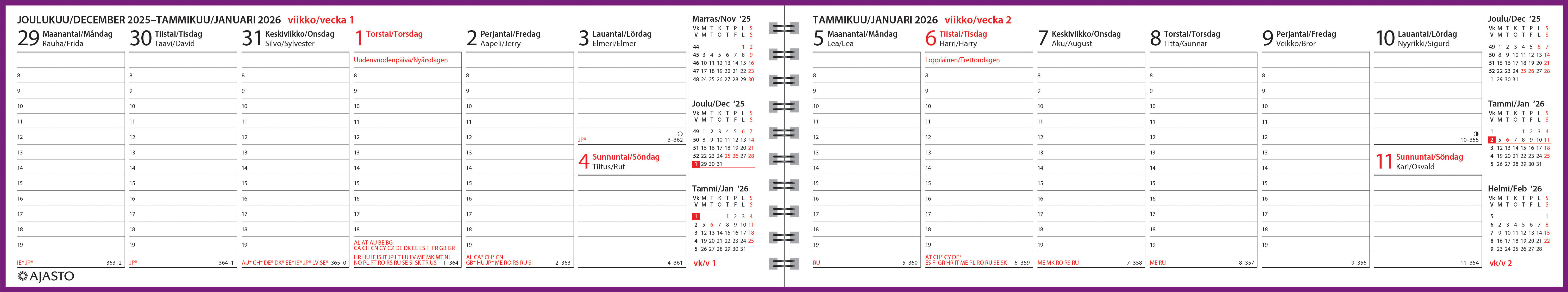 • kansalliset vapaapäivät päiväkirjan sivuilla ja luettelona