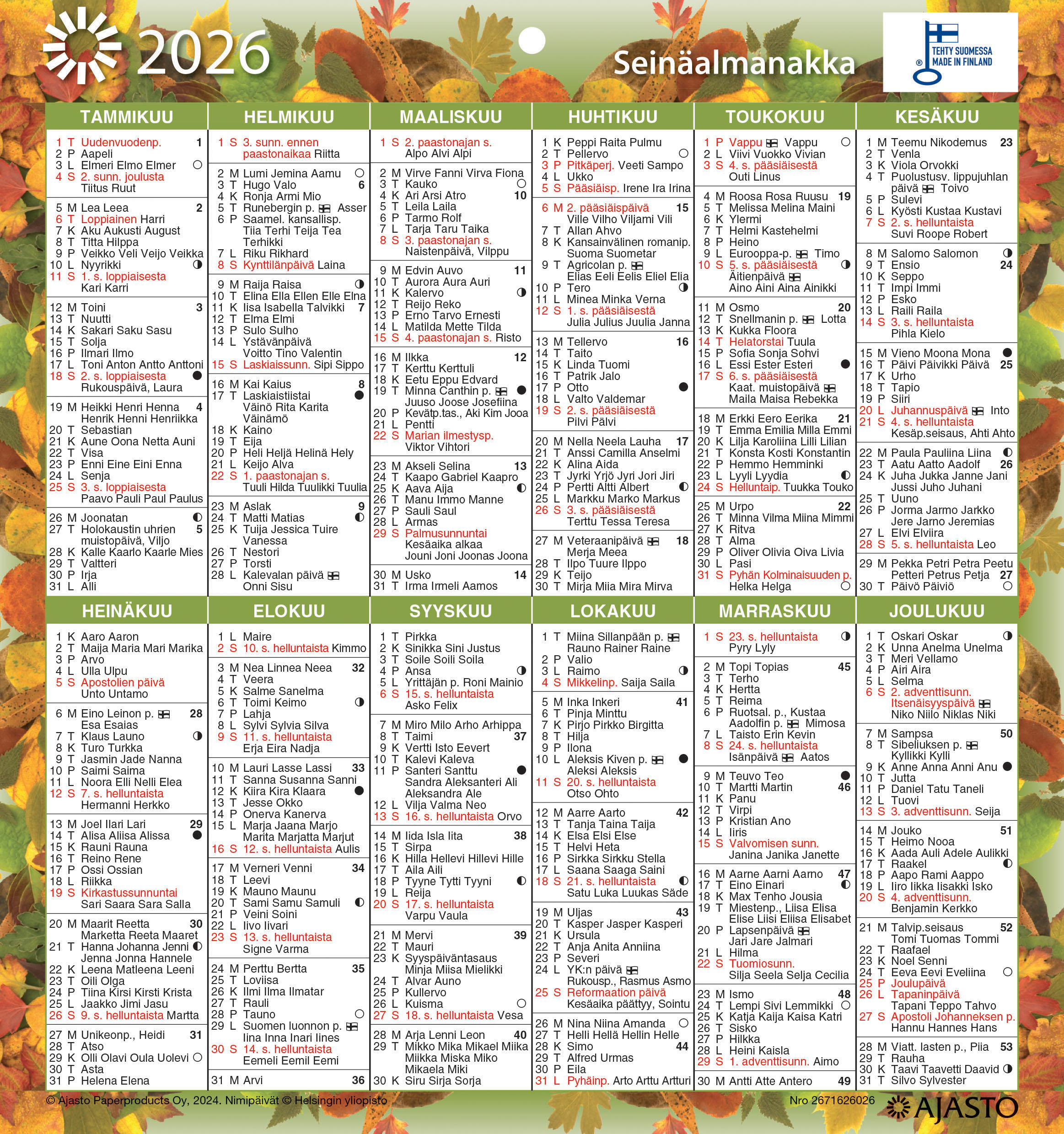 Suosittu taulukkokalenteri, kuvio- ja värivaihtoehdoilla
